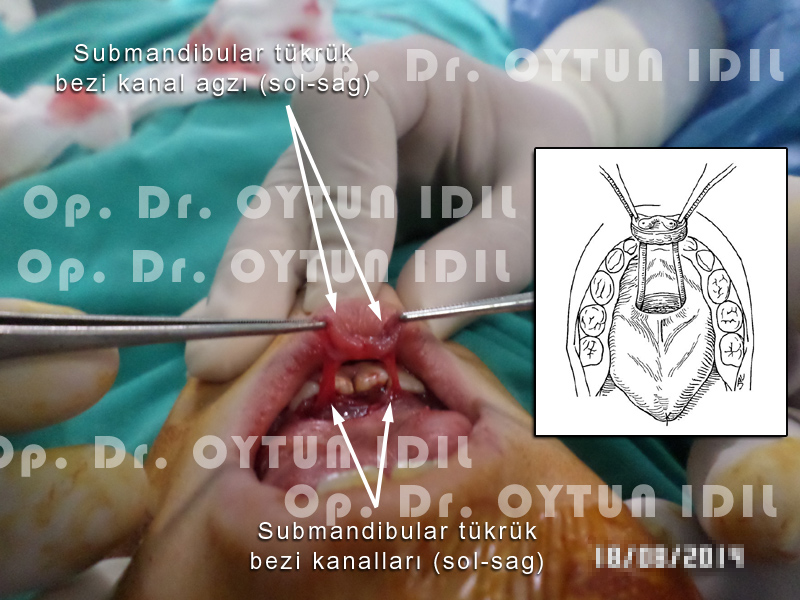 Aşağıdaki fotoğraf bir ameliyatımızda alındı. Burada hastanın çenealtı tükürük bezlerinin kanalları görülüyor. Bu kanallar ortaya çıkarılıp bağlanıyor. Fotoğrafın içinde bu ameliyat ile ilgili olarak kitaplarda bulunan çizimi göreceksiniz. Tam olarak kitaplarda tarif edilen tekniği uyguluyoruz.